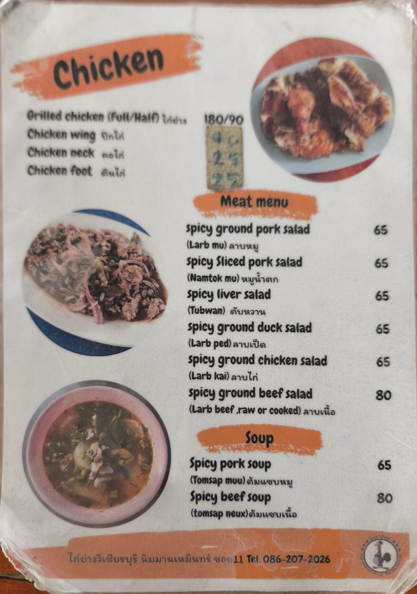 blog タイメシ(一般の食堂) ニマンヘミンのガイヤーンの店。ガイヤーン ウィチアンブリー 2025年12月2日 パタヤではあちこちでガイヤーン(焼き鳥)を食べたが、チェンマイでは店が少なく感じる。 今まで行ったのは2軒だけ。 確かにガイヤーン、うまい。SP Chicken ไก่ย่างเอสพี2025.9.11旧市街にガイやーんがうまい店があるとおちょしの動画で知った。 10時過ぎで空いていた。 オープン直後だったのか。 紙の撮影を忘れたが、テーブルにあるこのメニューを見て、番号をチェッ... 今まで食べたタイ料理で一番かも。ネンムーオップオーン タラートムアンマイ2025.7.13日本人4人で利用してきました。 日曜日、11:30で混んでいました。帰る時には列ができていました。 客席も多いです。 肉がとにかくうまそう。 ツボの中で豚の肉つるして油を落とす。お... ニマンヘミンにもあるということで行ってきた。 こう見えて、中にはいると満席。 焼いてます! メニューはこちら。 高級エリアだが、料金は庶民価格でありがたい。 ガイヤーン ハーフB90。 パパイヤと塩卵のサラダ。ノースパイシー。B60 おいしかったです。 Facebook post