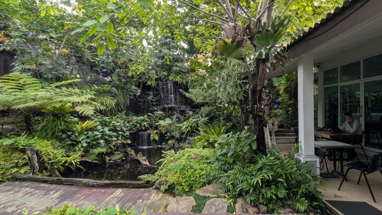 敷地内に滝があるカフェ。คาเฟ่ เดอ โสต Cafe de Sot