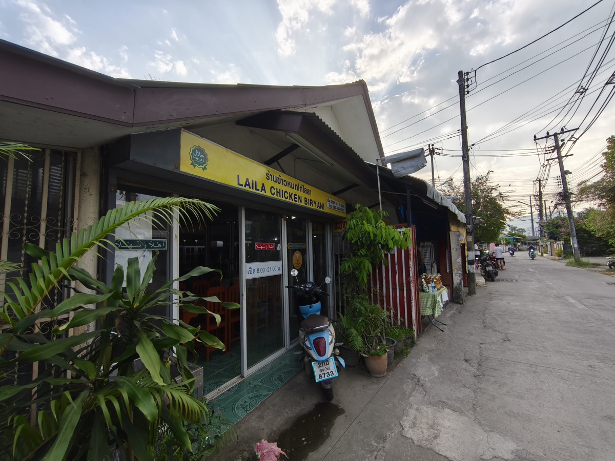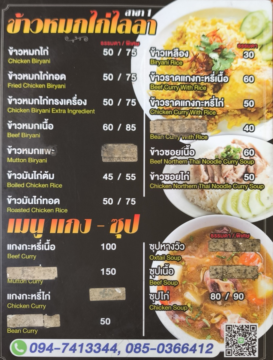 blog ピン川・新市街 洋食など、その他海外の料理 ビリヤニ、本格的。ライラー ไลลาข้าวหมกไก่ 2026年2月28日 また近所に隠れ名店があった。 メニューはこちら。 一番上のチキン・ビリヤニの大盛りB70にする。 あと、サラダ。B50 けっこう量がある。スープが濃くておいしい。タイのスープは味がないことがほとんどなので。 お腹いっぱい。大満足。また行こう。奥さんが日本語を少し話せた。 Facebook post
