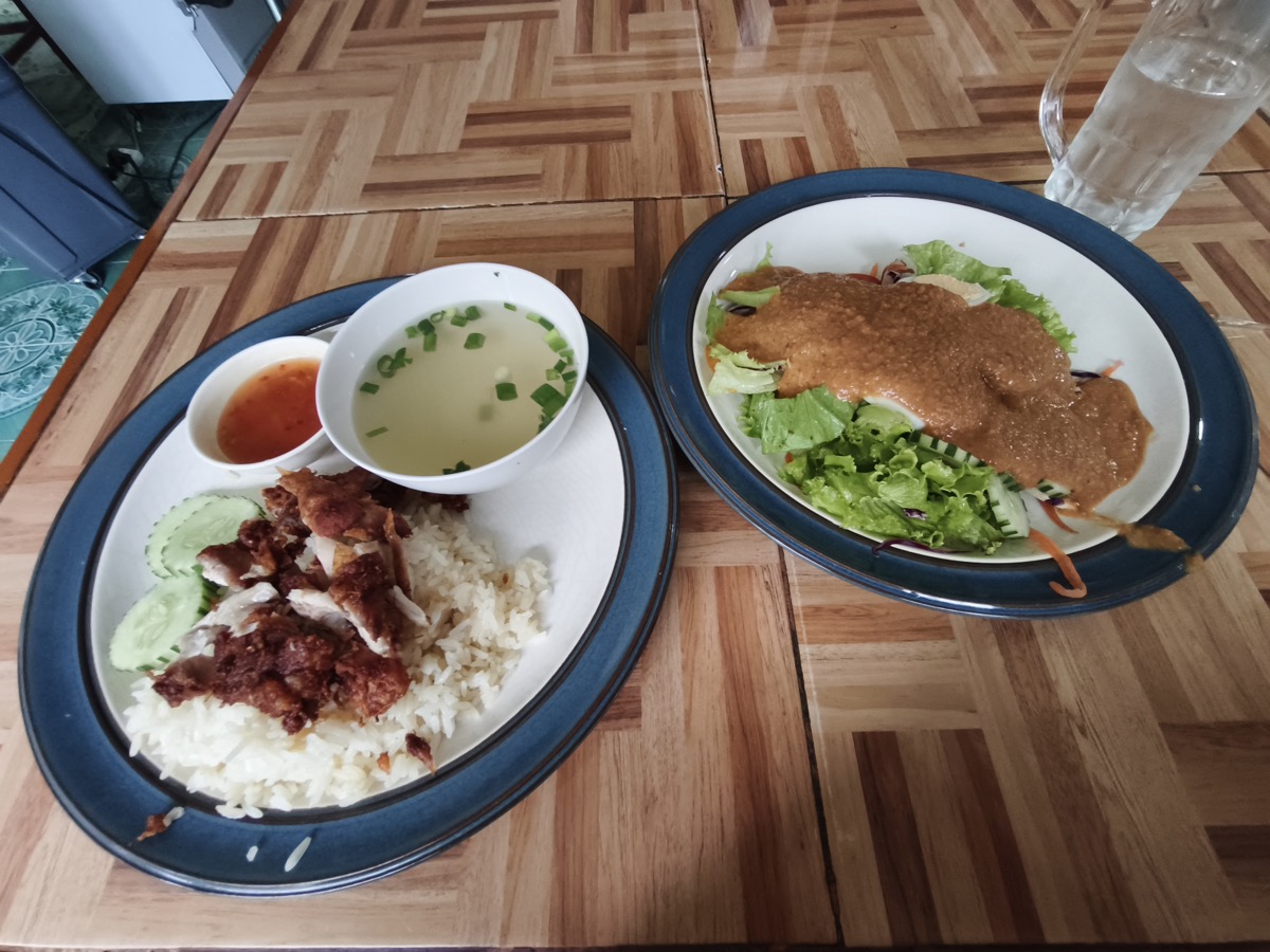 揚げたチキンのカオマンガイ。サラダにいつも乗っている、ピーナツソース、ガド・ガドがなかなかうまい。