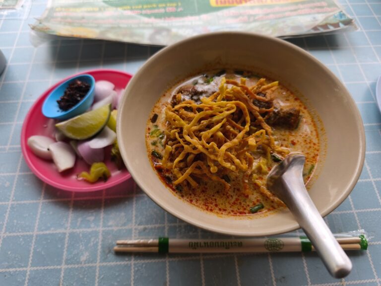 袋小路、前の道はほとんど車は通らない。 カオソーイは無難な味。他の味も試してみたい。