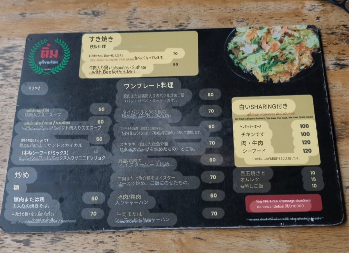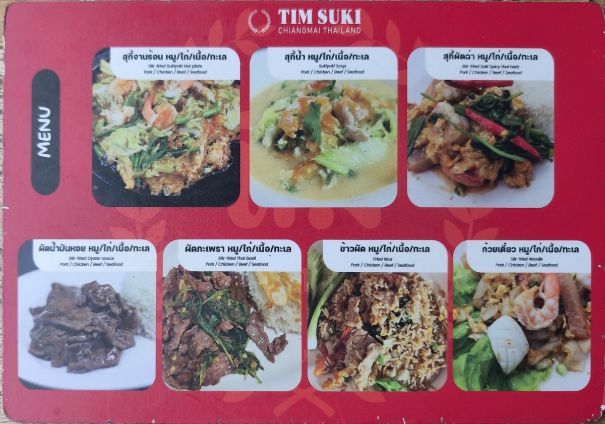 blog タイメシ(一般の食堂) ピン川・新市街 久しぶりの鍋。Suki Khun Tim ติ๋มสุกี้จานร้อน ต้นตำหรับ (เจ้าเก่า) 2026年4月21日 いつもよく通る道沿いに混んでいる店があるので寄ってみた。 外観を撮影したつもりだったが、うまく撮れていなかつた。 メニューはこんな感じ。 一番のおすすめだと思われる一番上のすき焼き、チキンにしてみた。 鍋があつあつできた。考えてみれば、鍋アツアツは今まで食べたなかでなかったかも。 ごはんも追加注文。 またほかのメニューも試してみたいと思います。 Facebook post
